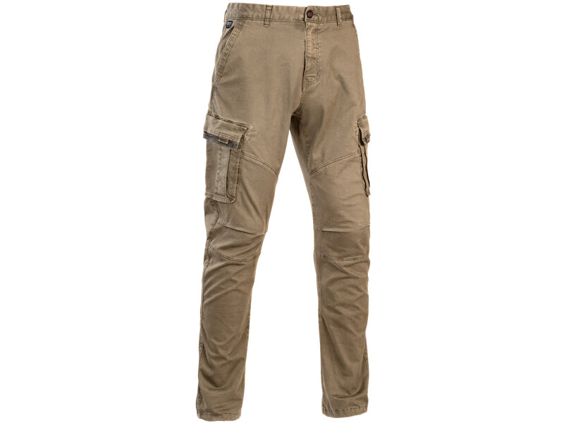 Pantalone lungo cargo con due tasche frontali con bordi rinforzati, due spaziose tasche laterali e due tasche posteriori con chiusura a bottone.